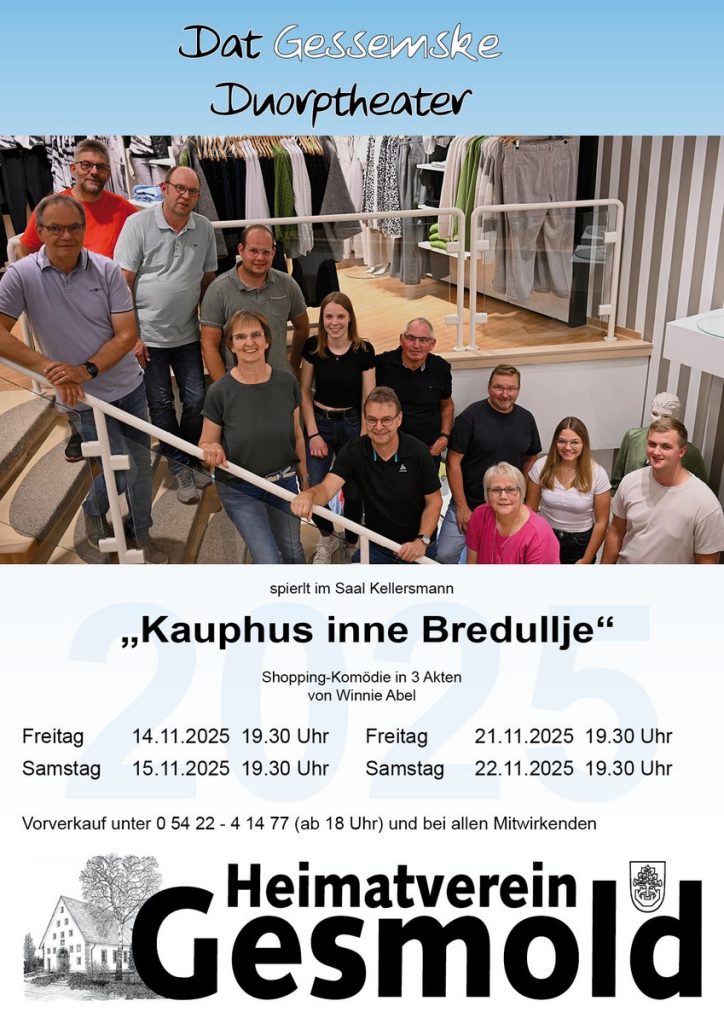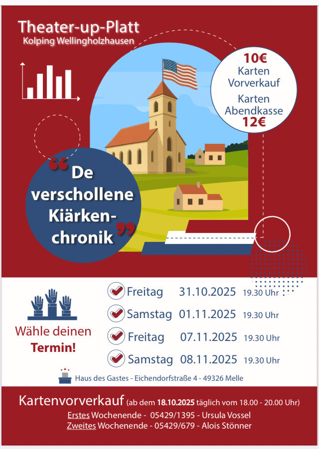 Der Heimatverein in Gesmold, die Kolpingfamilie in Wellingholzhausen und die Junge Bühne St. Matthäus in Melle spielen wieder auf. Dreiunterhaltsame Theaterstücke warten auf Sie und Euch. Besorgt euch jetzt Karten. Infos und Kontaktpersonen findet ihr auf den unten aufgeführten großen Plakaten: